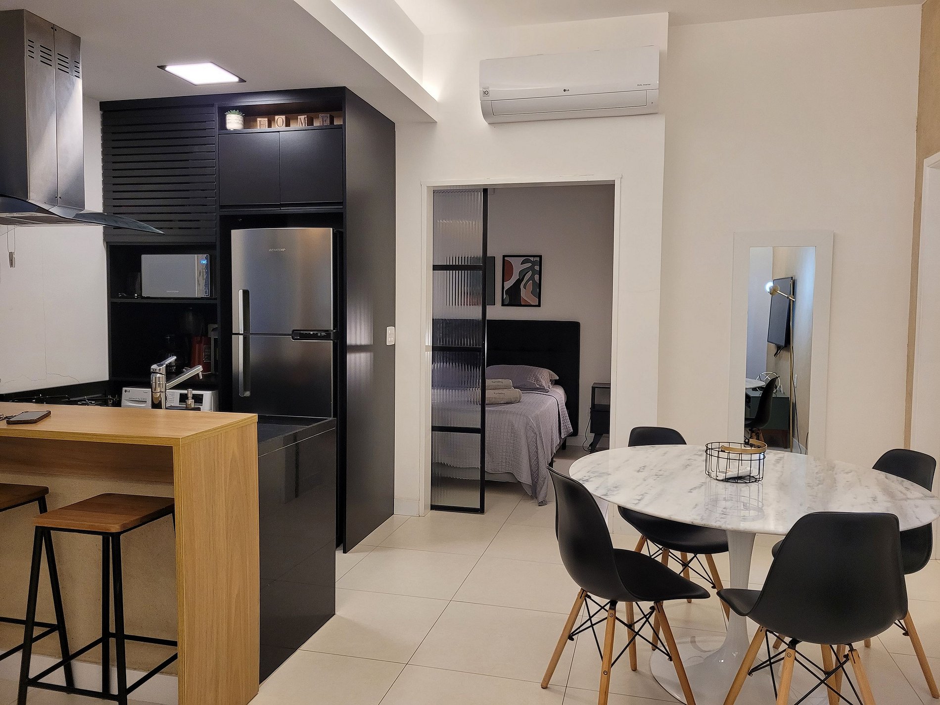 O apartamento se destaca pela decoração moderna, ambientes bem planejados e uma atmosfera acolhedora que combina praticidade e conforto. A cozinha americana totalmente equipada, a sala integrada e o quarto confortável tornam o espaço ideal para quem busca uma estadia funcional e com estilo no coração de Copacabana.