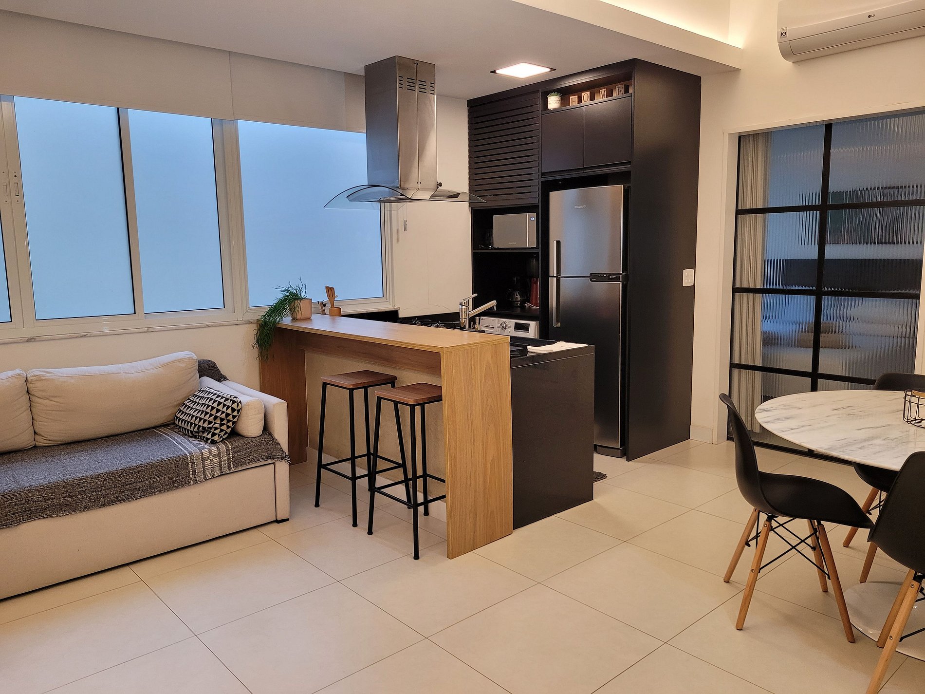 - Sala com sofá-cama de casal, Smart TV, TV a cabo, internet de alta velocidade, ar-condicionado split e cortinas blackout