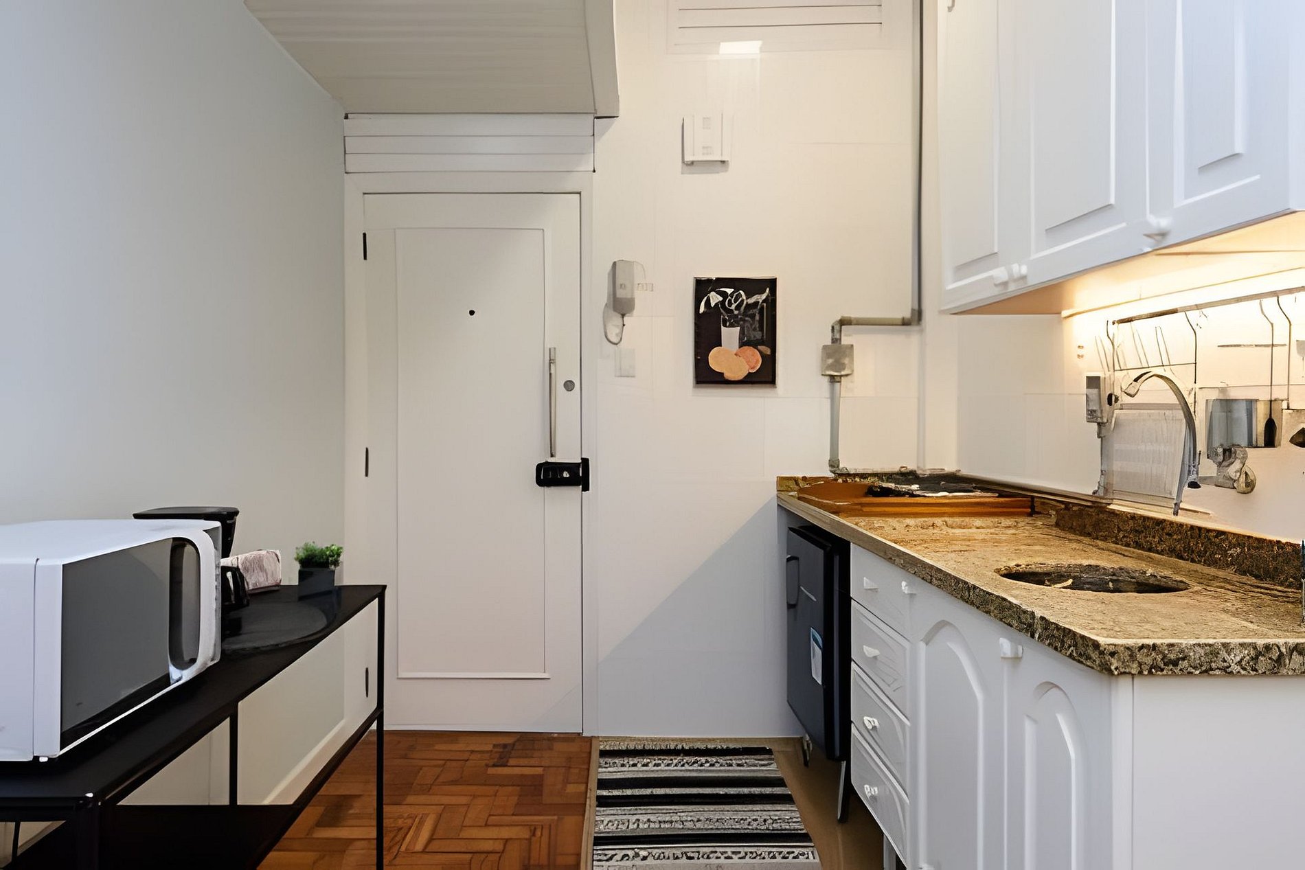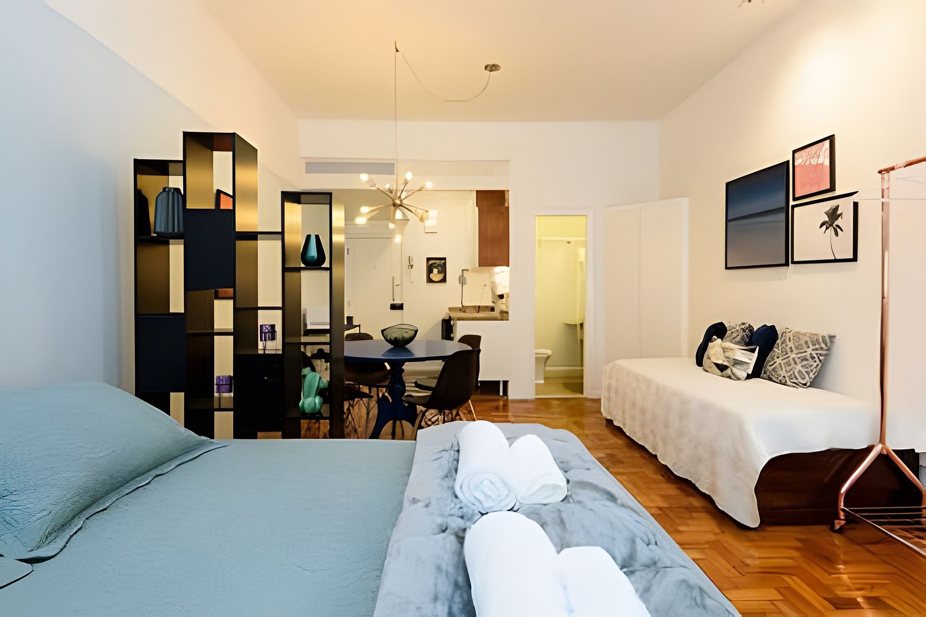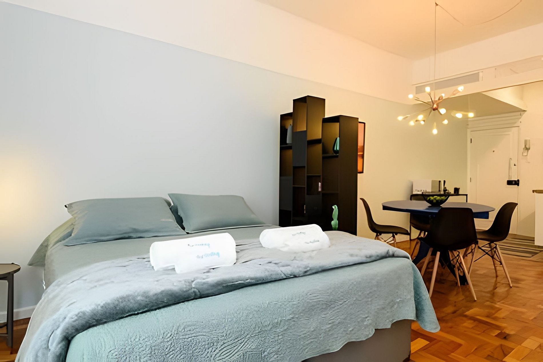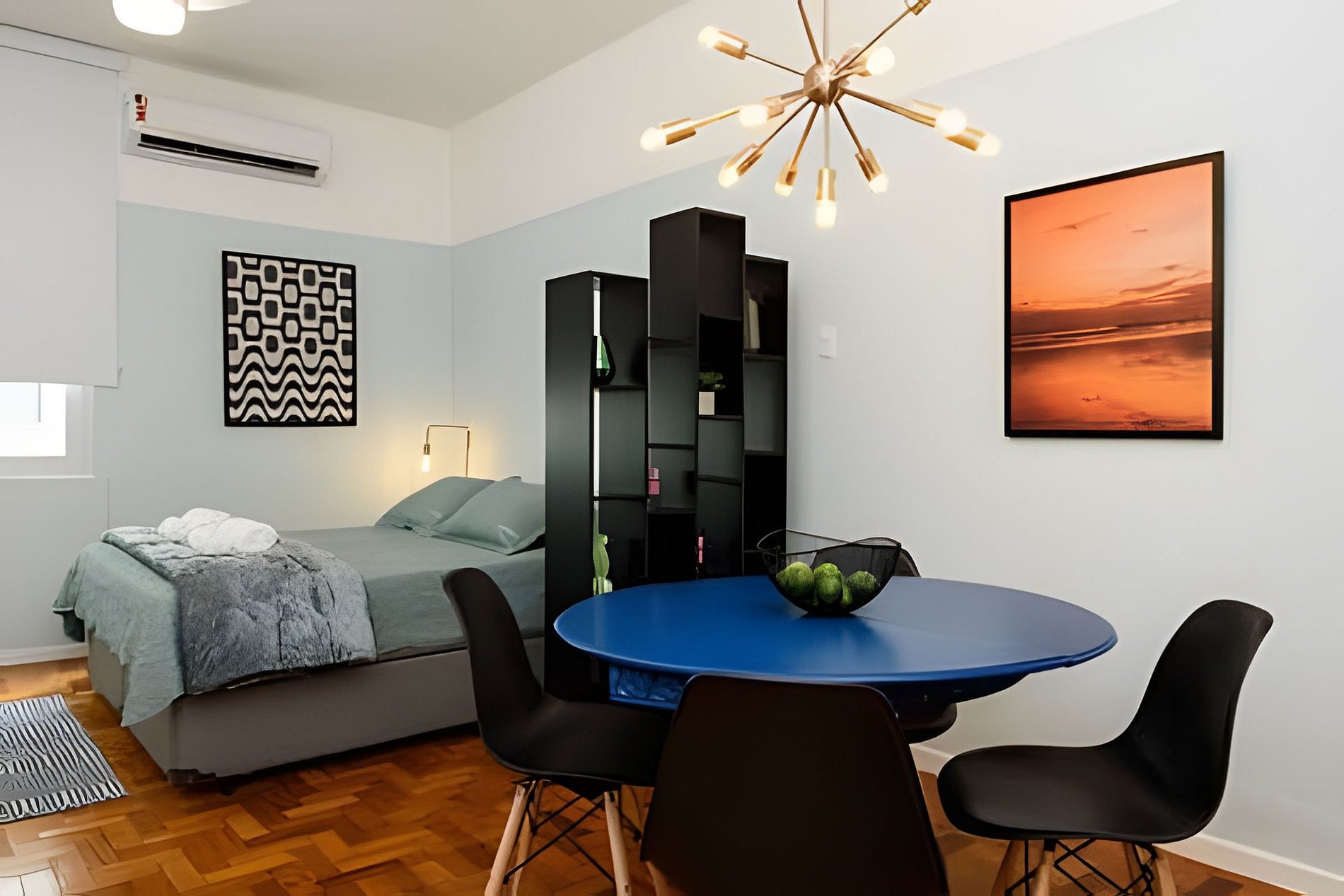Este imóvel é um charmoso studio, confortável e finamente decorado. Possui uma cama queen e uma bicama. Está situado em um edifício residencial com portaria e segurança 24hs.